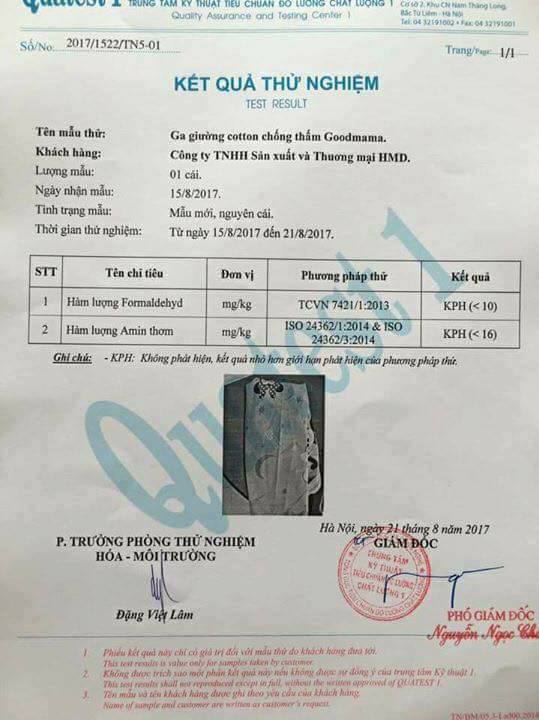 Kết quả thử nghiệm thành phần hóa học vải Ga chống thấm Goodmama của trung tâm đo lường 3 (Quatest3) (Quy định của Bộ Công Thương tại thông tư 32/2009/TT-BCT) cho thấy hàm lượng đều trong tiêu chuẩn cho phép, an toàn cho bé.
